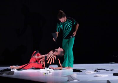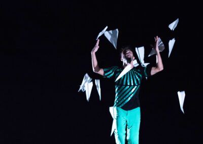 I corpi dei due performer ruotano, orbitano, accelerano e decelerano con regolarità, si attraggono e si respingono come calamite, creano paesaggi emotivi, stabiliscono delle regole in rapporto alle linee e le infrangono, si percuotono e si cullano. Lo spettacolo è stato pensato come un sistema interattivo : il pubblico è invitato a costruire aeroplanini di carta, poi a lanciarli in scena a discrezione nello spazio ‘gravitazionale’ dei performer, infrangendo lecitamente lo spazio intimo della visione. Alea iacta est!