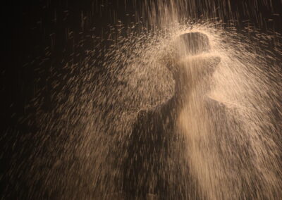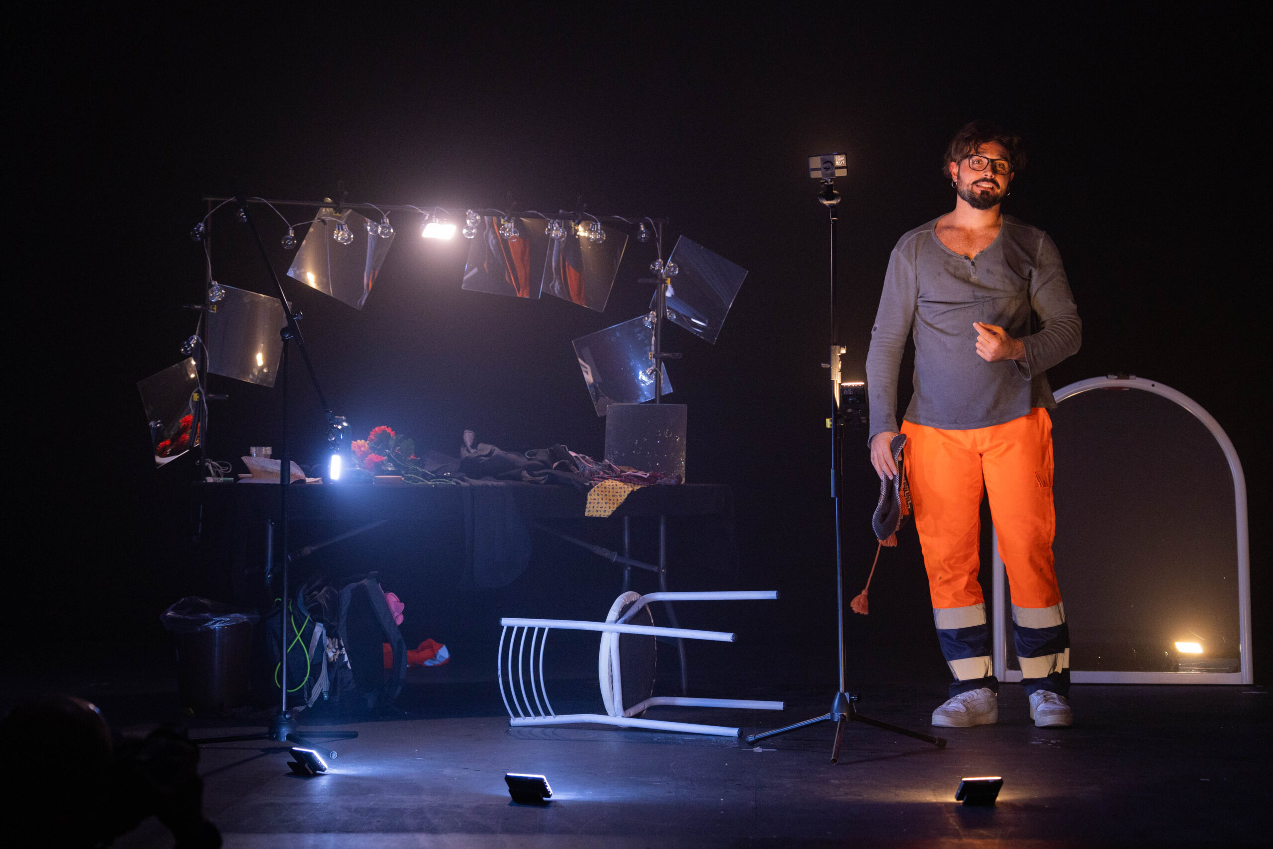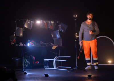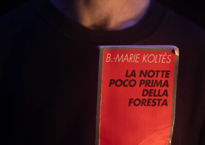 Liberamente ispirato al potente monologo La notte poco prima delle foreste di Bernard-Marie Koltès, Come un angelo in tutto questo bordello è un viaggio teatrale nel caos dell’esistenza urbana. Un flusso continuo di parole, pensieri, memorie e deliri, in bilico tra rabbia e poesia, che scorre sulla scena come un fiume senza argini.